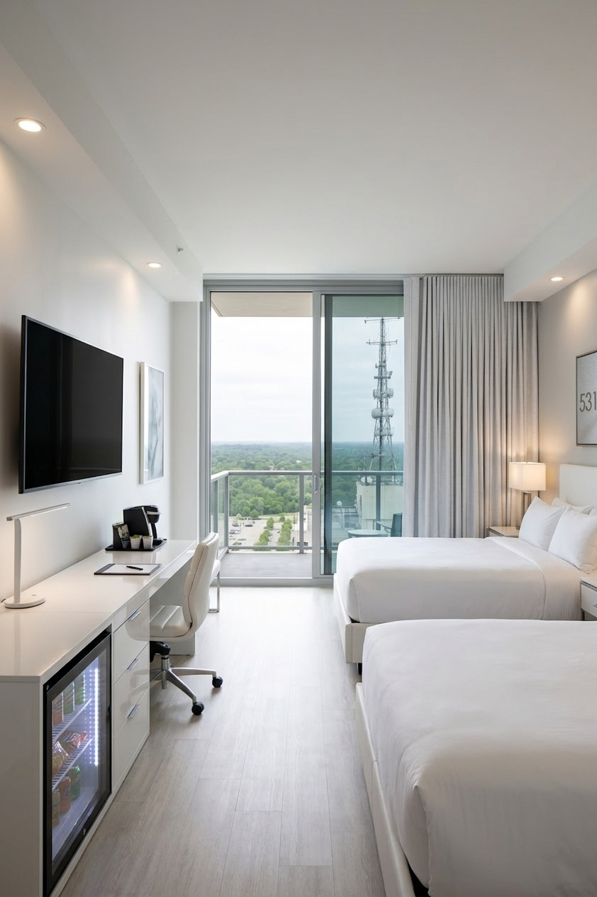 Each suite includes king-size beds, workspace areas, balconies, and stunning skyline views.