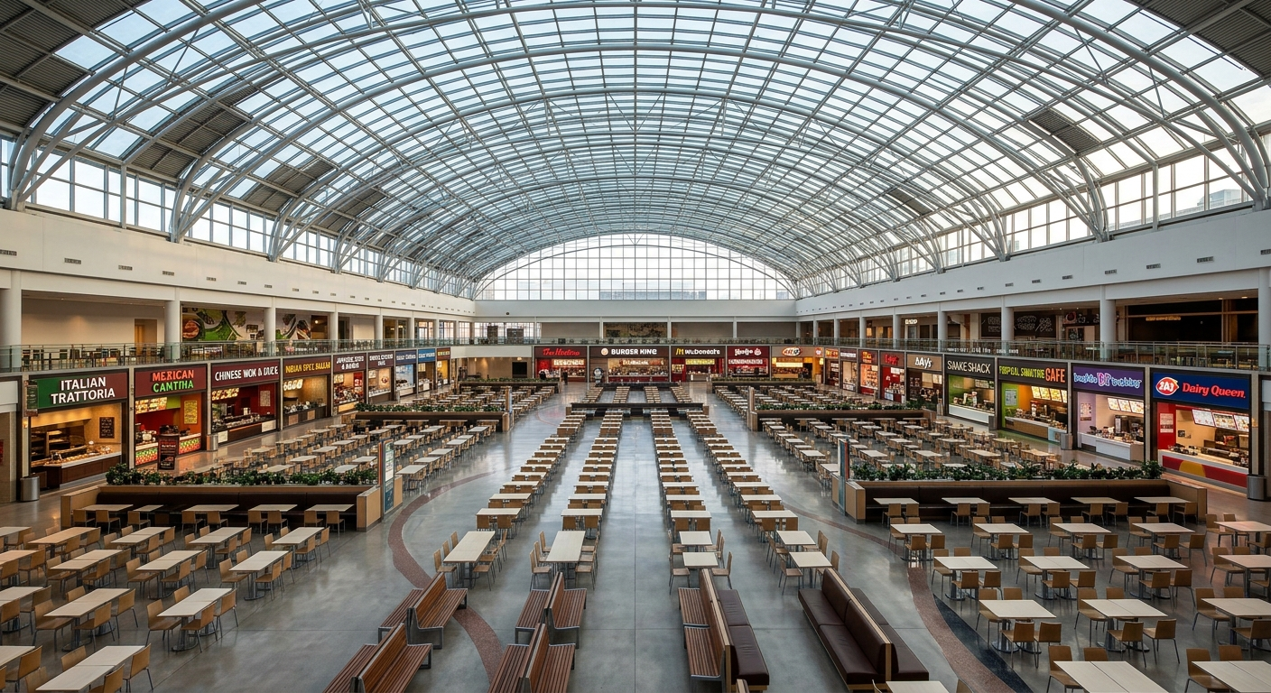 A vibrant dining hub offering flavors from around the world and serving as the social heart of the community center.