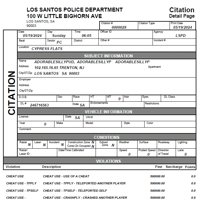 If you are attempting to capture a subject wanted for one or more criminal activities, and they escape by leaving the session, you are now effectively unable to arrest them— therefore you would issue them a citation. Issuing a citation is considered a hands-off equivalent to an arrest, and is recommended to be issued when an arrest is not possible for circumstances potentially out of your control. Other incidents that would warrant a citation rather than arrest for example, would be the appropriate procedure when handling a cheater. Cheaters will often have cheat tools to allow them to initiate cyber-attacks that can cause much grief upon other players, such as locking-down player movements, kicking or banning them from sessions, and even crashing games of other players. Because of this, standard procedure when coming across a cheater is to silently issue them a citation and move on. In most cases, we recommend leaving a session once discovering a cheater, as cheaters often have the power to be malicious and cause unwanted effects such as draining the in-game bank accounts of other players or doing other similar egregious acts to other players.